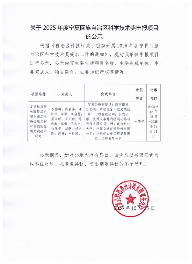 根據(jù)《自治區(qū)科技廳關(guān)于組織開(kāi)展2025年度寧夏回族自治區(qū)科學(xué)技術(shù)獎(jiǎng)提名工作的通知》,現(xiàn)對(duì)我單位申報(bào)項(xiàng)目進(jìn)行公示,公示內(nèi)容主要包括項(xiàng)目名稱(chēng)、主要完成單位、主......